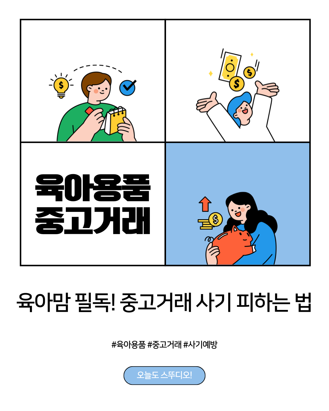육아하면서 안 쓰는 물건이 쌓이고, 또 새로 사야 할 건 넘쳐나죠.그래서 중고 거래, 특히 육아용품 중고 거래는 정말 필수예요!하지만 당근마켓이나 번개장터를 쓰다 보면 "혹시 사기당하는 건 아닐까?" 걱정되는 순간이 있죠.오늘은 실제 엄마들이 자주 겪는 중고 거래 사기 사례와그걸 방지하기 위한 현실 꿀팁을 정리해봤어요.🚨 자주 당하는 중고 거래 사기 유형"입금했는데 잠수탔어요"→ 선입금 유도 후 연락두절"직거래 장소에서 물건 바꿔치기"→ 멀쩡한 상품 사진과 다른 물건 들고 나옴"정품이라더니 가품이더라고요"→ 육아템도 고가일수록 정품 여부 중요🛡️ 사기 예방 꿀팁✅ 직거래는 낮, 사람 많은 곳에서CCTV 있는 카페, 경찰서 근처 추천✅ 가능하면 현금 NO! 계좌이체 추천거래기록 남기기 + 토스/카카오페..